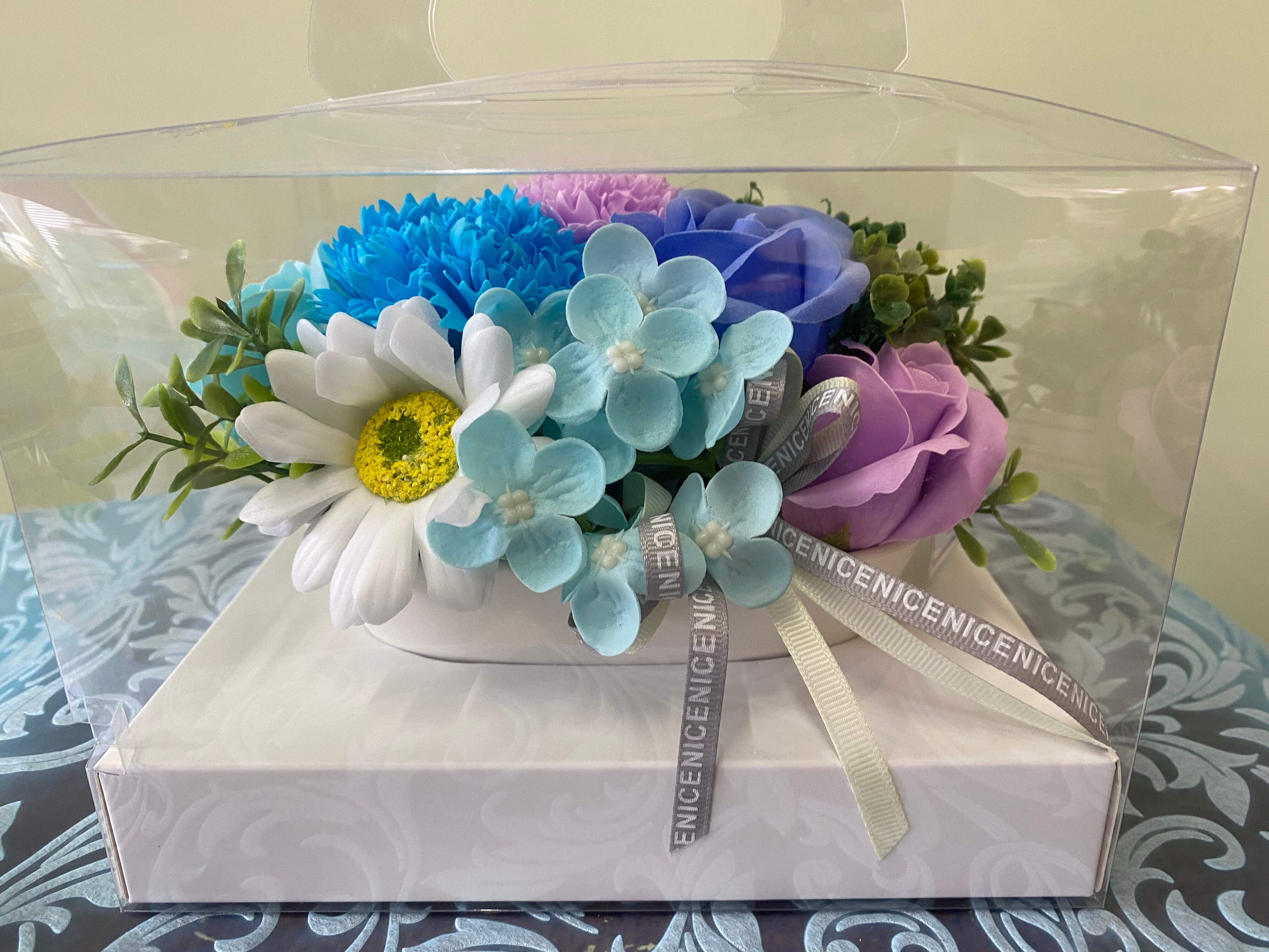 石鹸素材で作ったお花のシャボンフラワーAは、ブルー/パープルを基調にした可愛らしいラウンド系のアレンジメントです。ケース付きなので、ホコリの心配もなしで長く楽しめます。そのままお飾りいただいても良し、ラッピングペーパーを取り外すとテーブル中央などで360度お花が楽しめます。