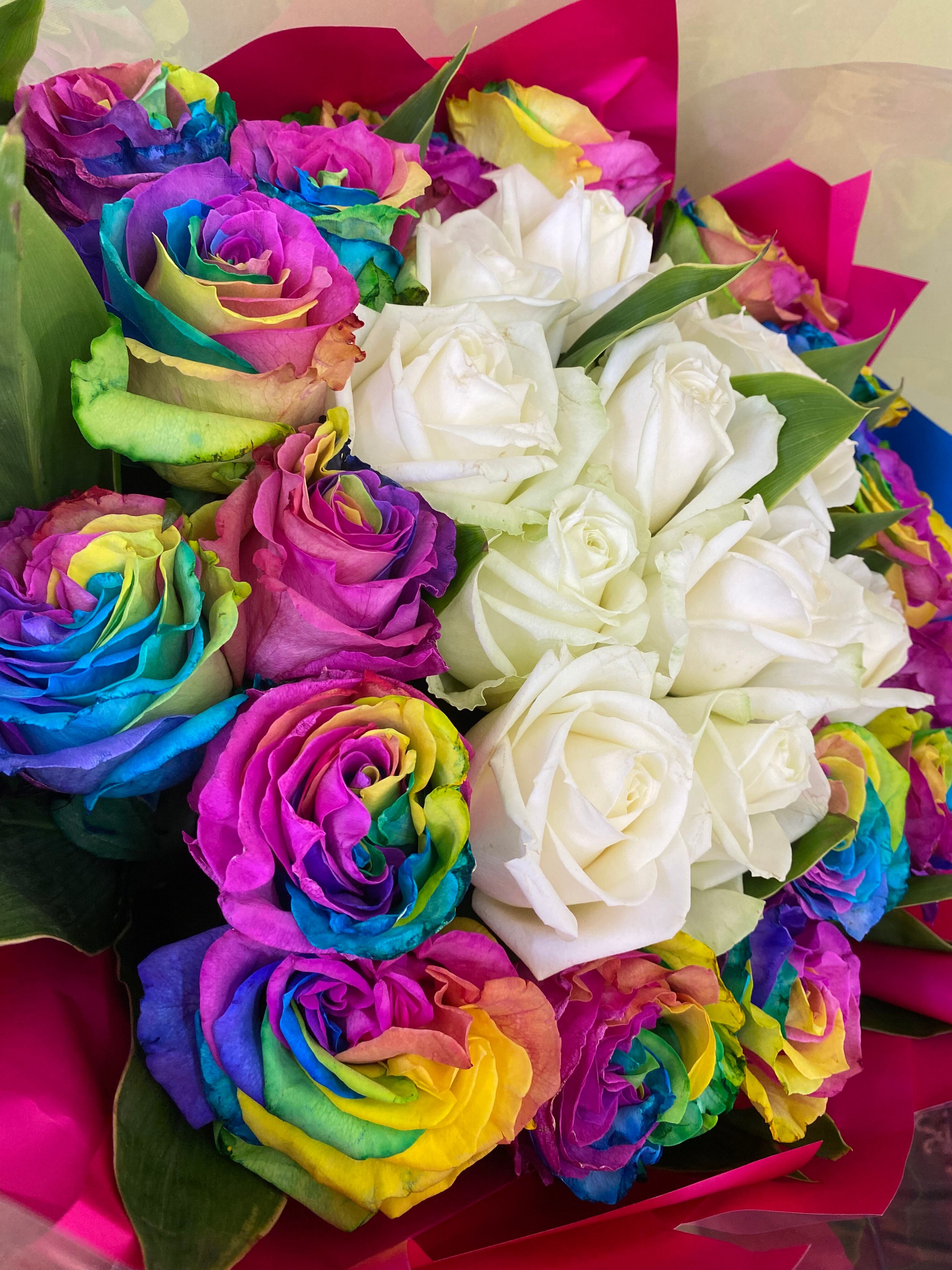 鮮やかなレインボー薔薇とホワイト薔薇の豪華な花束です。