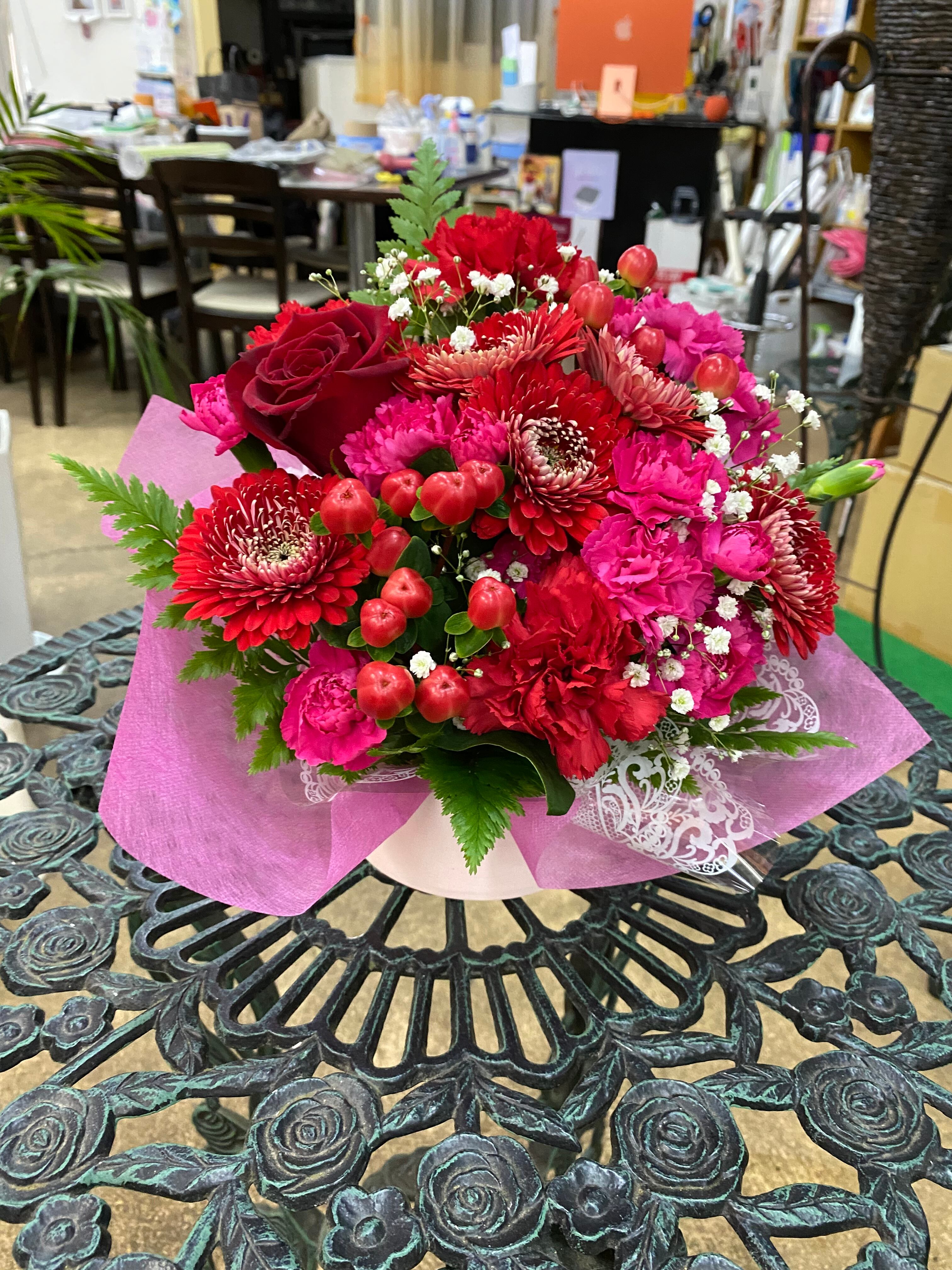赤は情熱を感じるお花の代表格なので、愛を伝えたいとか喜ばしいときや燃えるときに効果的なお花。鮮やかさが印象的なお花の構成で制作していますので、きっと想いが届くと思いますよ!
