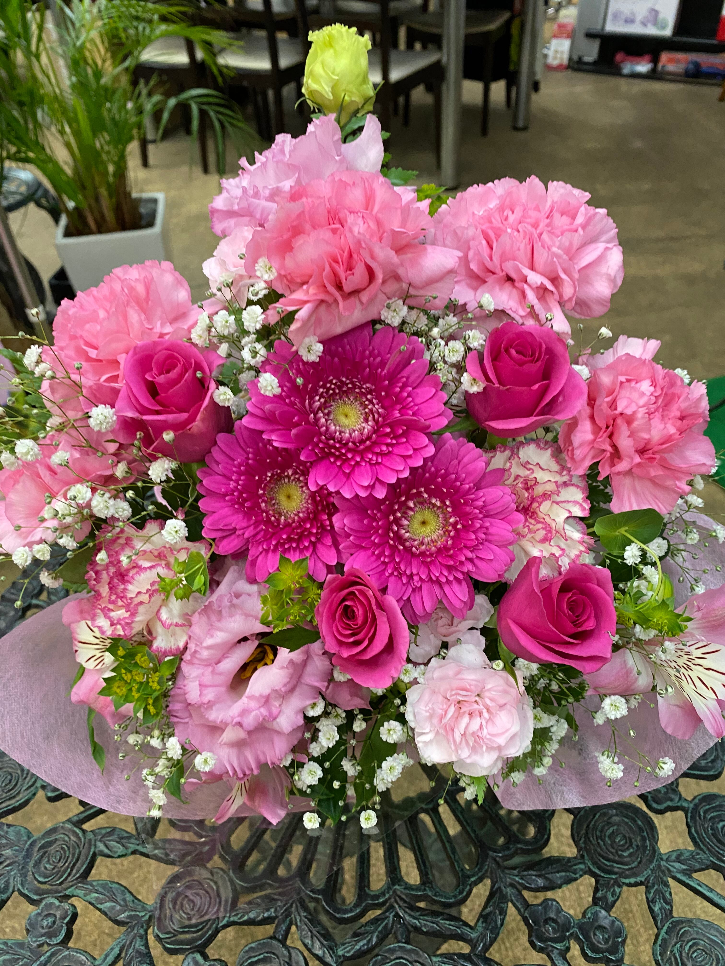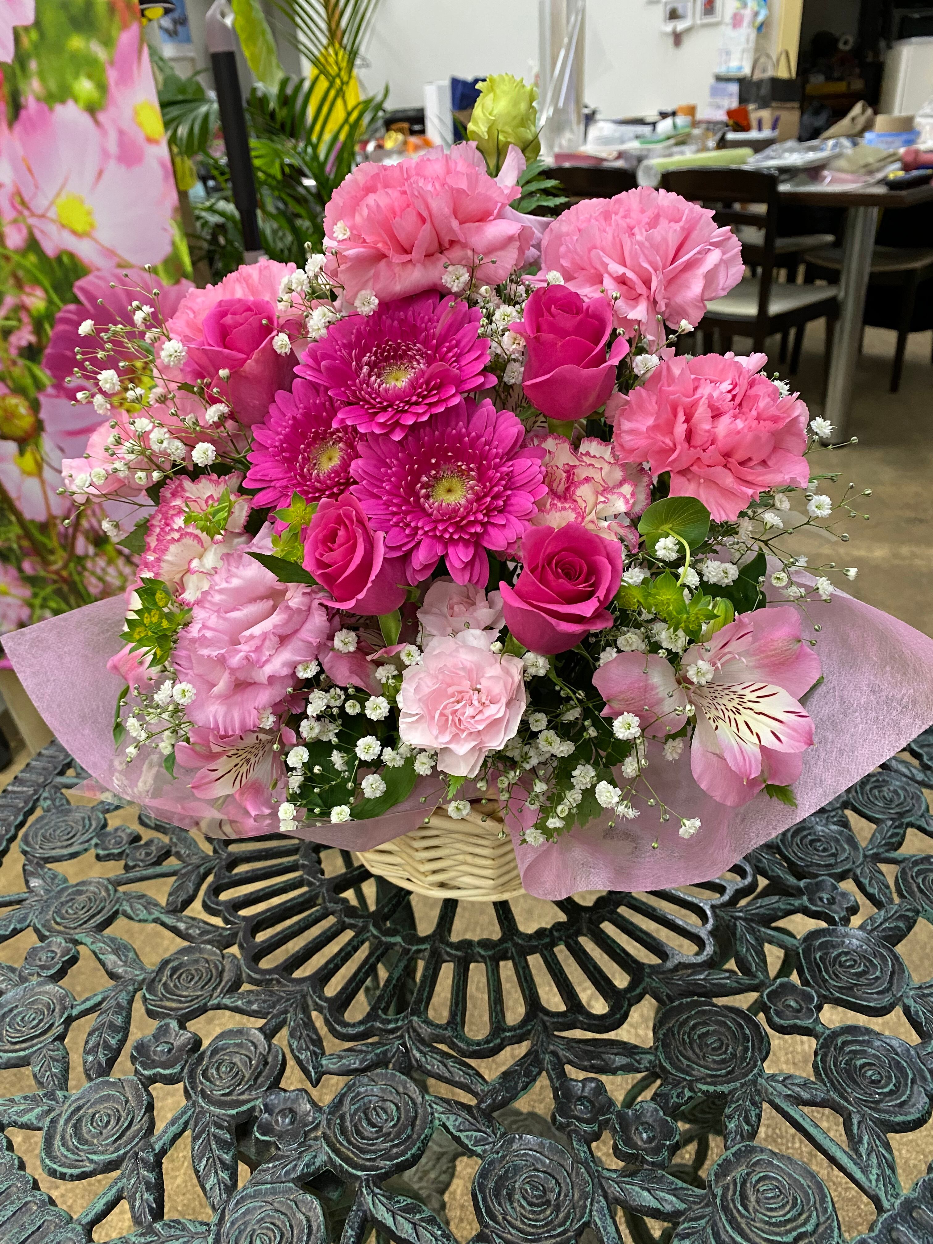 ピンクのお花が集まってやさしさを醸し出してくれるお花たちのアレンジメント。